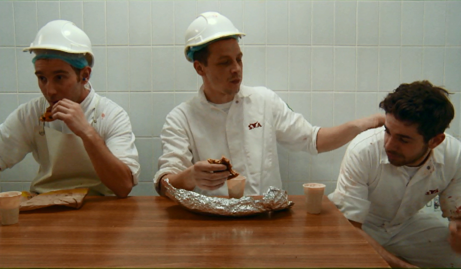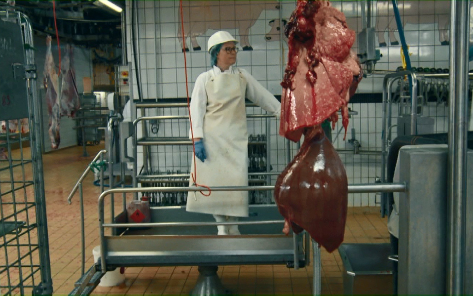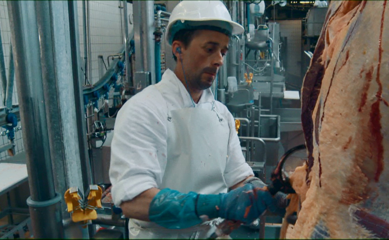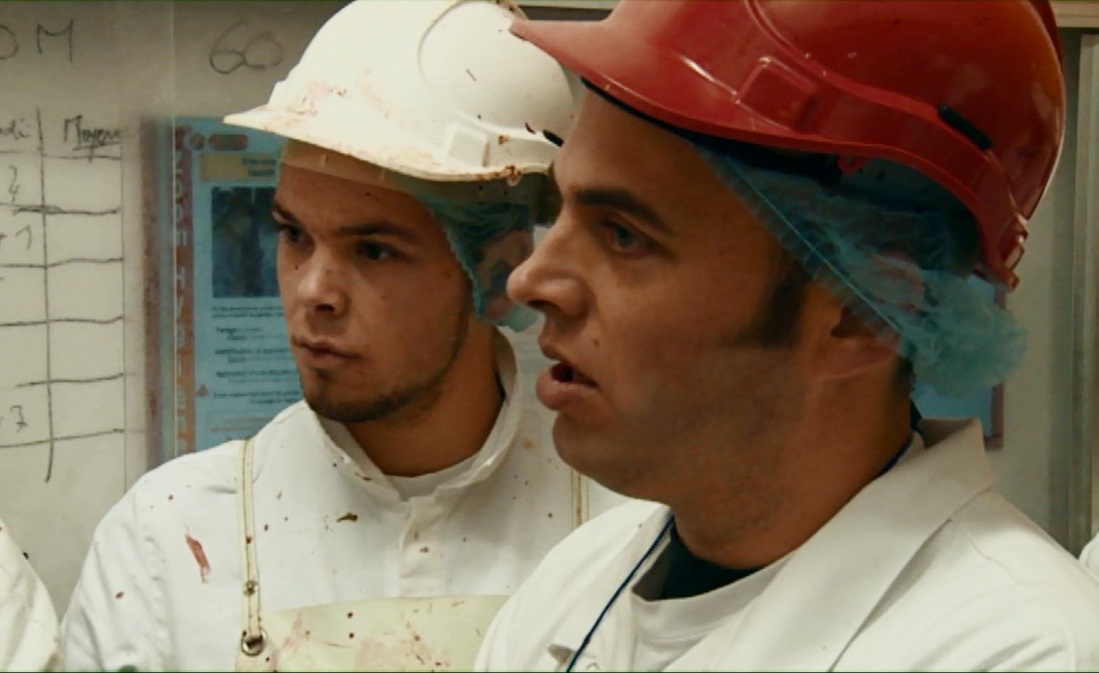 Le film débute par quelques minutes d'échauffement d'un ouvrier sur son poste de travail, scène que l'on retrouve tout au long du film, signe que le travail nécessite qu'on soigne sa condition physique. Dans cet environnement très masculin, pour Steven, Simon, Yohan, Aboubacar, Isabelle et les autres, les pauses sont chronométrées. Les accidents du travail ne sont pas rares. Les gestes de chacun sont constamment surveillés, tant par soucis de sécurité que de productivité. Le délégué du personnel passe en revue les installations, s’efforçant de faire reconnaître la pénibilité de certains postes auprès de la hiérarchie. "Je vois des personnes qu’on met à la porte parce qu’elles ont les épaules bousillées. La dernière en date avait 35 ans et elle aura des douleurs jusqu’à la fin de ses jours." L'environnement sonore - crissements des lames contre les fusils à aiguiser, entrechoquement des crochets métalliques, chaînes et cisailles - n’en fait pas moins oublier la sensibilité des ouvriers vis-à-vis des carcasses animales qu'ils manipulent. "J’ai un ami, il a fait une semaine et demie et il est reparti. C’est pas donné à tout le monde. Il avait du mal à manger de la viande après."