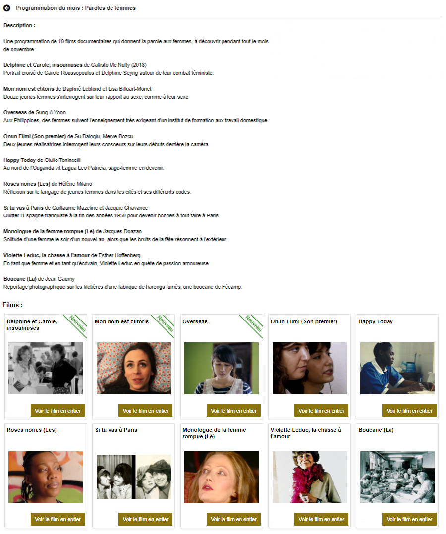 - Pour les programmateurs et vidéothécaires, les films sont accessibles en intégralité sur chaque fiche film, via l'onglet "visionner le film en entier" à droite de l'extrait.
