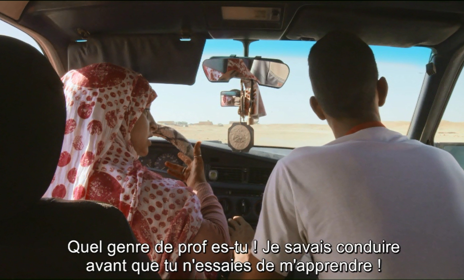 Le trio passe ses journées dans une chambre plongée dans la pénombre. On tapote sur son téléphone, on échange des vidéos avec les amis exilés en Europe. L’un des garçons frôle la dépression, l’autre, plus entreprenant, travaille comme mécanicien dans un garage. L’automobile aimante tous les rêves d’évasion. Impatiente de savoir conduire, la jeune fille peste contre le copain qui lui sert de moniteur. Le moteur cale, la voiture zigzague dans le désert mais pas question de renoncer. L’immobilité, ici, n’est pas que le lot des femmes, elle asphyxie tous les habitants du camp. Assigné à résidence, privé de ressources par le colonisateur marocain, le peuple sahraoui vit depuis 40 ans sous perfusion de l’ONU. Les hymnes patriotiques ne font plus vibrer la jeune génération. Pour la joie de quelques touristes, les jeunes du camp se livrent à une course débridée, non de chameaux mais de 4x4. L’équipée s’arrête net dans les dunes ; un véhicule s’est embourbé.