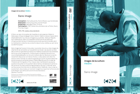 Sans image s’articule en trois actes. Le premier s’ouvre sur des images de chantier et se concentre sur la question du travail. Les jeunes ouvriers découvrent en parallèle la pratique du théâtre et explorent les possibles de la voix et de l’imagination. L’improvisation théâtrale fait écho aux cours d'alphabétisation où ils sont invités à décrire librement ce qu'ils ressentent depuis leur arrivée en France. Le deuxième acte décrit la tension entre individu et collectif. Epaulée par la CGT, la grève s'éternise durant plusieurs semaines devant l’Opéra Bastille puis au musée de l'Histoire de l'immigration. Pour chacun des manifestants se pose la question de quitter le mouvement dès le fameux récépissé en poche ou de continuer la lutte jusqu'à la régularisation de tous. Le dernier acte suit les jeunes hommes vers la représentation théâtrale : deux corps se soutiennent, bras tendus, et viennent malgré tout exprimer la force du lien et de l’espoir que véhicule toute forme de résistance.