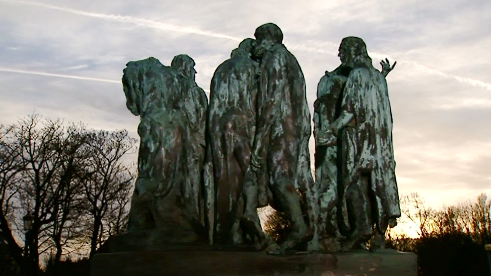 Depuis que Rodin leur a donné forme en 1895, les Bourgeois de Calais sont devenus l'emblème quasi sacré de la cité. Celle-ci se reconnaît dans ces notables médiévaux qui résistèrent à l'envahisseur anglais et risquèrent une mort tragique malgré leur reddition finale. Novateur et contemporain des débuts du cinéma, Rodin ne raconte pas l'évènement historique mais se concentre sur les six hommes tourmentés, chacun exprimant une étape vers la résignation au sacrifice, comme si une caméra enregistrait la résolution progressive d'un terrible doute dans une seule conscience. L'artiste est parvenu à cette force d'expression grâce à différentes versions, hommes nus puis vêtus, à son goût pour le modelage de la terre, dont on retrouve l'empreinte dans le bronze final, et à sa pratique de l'assemblage de fragments anatomiques moulés ou coulés séparément, parfois interchangeables. La restauration a consisté à consolider la structure, nettoyer méticuleusement les surfaces et travailler la patine.