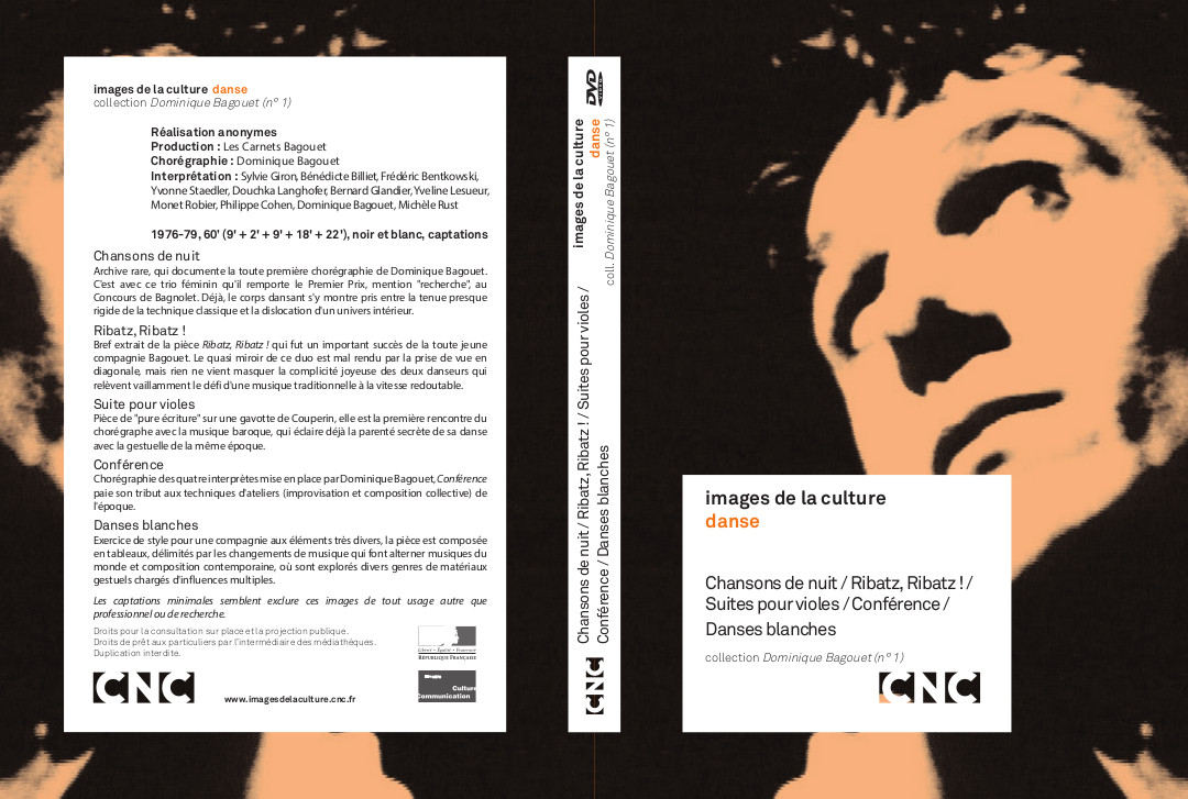 Chansons de nuit (1976, 9'. Réalisation : Jaque Chaurand). Ce film aux prises de vue accidentées est une pièce d'archive rare, qui documente la toute première chorégraphie de Dominique Bagouet. C'est avec ce trio féminin composé sur des mélodies de Tchaïkovsky qu'il remporte le Premier Prix, mention "recherche", au Concours de Bagnolet. Le trio, forme chère à Bagouet, oppose la danse légère et enlevée d'Yvonne Staedler et Bénédicte Billiet, en académiques blancs, à celle de Douchka Langhofer, en robe claire, isolée de ses deux partenaires par sa gestuelle fracturée et ses parcours errants. Déjà, le corps dansant s'y montre pris entre la tenue presque rigide de la technique classique et la dislocation d'un univers intérieur. Une troisième voie s'ouvre ici, qui s'imposera dans les pièces des années suivantes : le legato lyrique d'une danse moderne fluide, dont Peter Goss a transmis le secret à Bagouet. Apparemment abstraite - le visage des danseuses demeure neutre malgré la tourmente du geste -, la pièce ouvre tout un pan de la recherche à venir du chorégraphe sur l'expressivité du geste. Dans cet univers nocturne qui n'est pas dépourvu de jeu - celui que les enfants mènent parfois le soir à l'insu des adultes -, la danse du duo ne parvient pas à recouvrir l'inquiétude somnambule du personnage central, ses errances pleines de cassures. Portant, c'est elle qui l'emporte, continuant, inlassable, par-delà le noir qui marque la fin de la pièce.