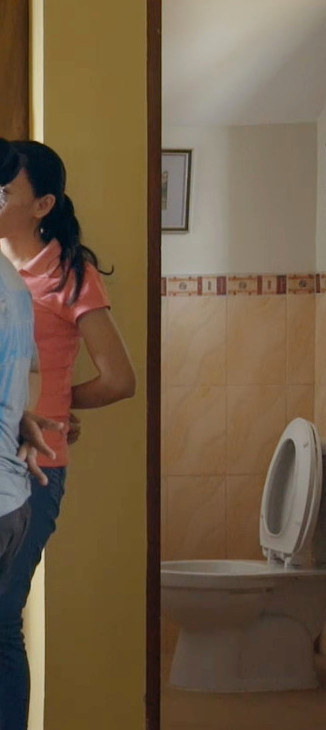 Cinq femmes se tiennent dans une pièce. Derrière elles se trouve un mini-bar avec des verres rangés dans des présentoirs, un comptoir et de hauts tabourets, tandis que quelques tableaux et un grand miroir ornent les murs. À droite, une porte est ouverte sur des toilettes. Détail intrigant : sous la pendule de la pièce figure une étiquette, Wall Clock (horloge murale), tandis qu'une autre est accrochée à une étagère, Bar Area (espace bar). L'une des femmes, face à la caméra, s'adresse aux autres qui l'entourent – trois étant debout également, tandis que la quatrième, assise, compulse des documents sur un tabouret devant elle. Si toutes sont vêtues assez simplement – pantalons et tee-shirts –, quelques détails différencient néanmoins la femme qui parle, signalant l'écart qui les sépare : ongles soigneusement manucurés et vernis, chaussures à léger talon, là où les autres sont en tongs ou claquettes. Nous sommes à la quinzième minute d'Overseas et la femme martèle, grand sourire aux lèvres : “Philippins are not weaks” (Les Philippin.e.s ne sont pas faibles). Cette assertion vient clôturer une tirade où elle exhorte les présentes à ne pas pleurer, quoi qu'il arrive. “Une leçon. Si vous êtes dans la maison d'un employeur, quoi qu'il arrive, quel que soit le problème, même si vos horaires sont complètement fous, quelles que soient les difficultés, ne pleurez jamais devant l'employeur. Compris ? Ne pleurez jamais devant votre employeur. C'est un signe de faiblesse.”