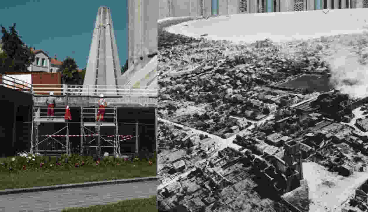 H. J.-L. : Comme on supposait que les églises seraient restaurées, nous avions décidé d’une sorte de slogan qui aurait été : “Nous vivons un temps de restauration” ; ce qui était valable également pour la mode de la restauration des films et la restauration au sens politique. Il est néanmoins clair que nous n’avons pas fait un film contre le principe de restauration, ni même contre les modes de restauration d’aujourd’hui. Sinon, ce serait le film qui serait devenu réactionnaire : il existe tout un discours réactionnaire sur le fait qu’on ne doit pas restaurer, qu’on restaure mal, que les modernes sont toujours moins bien que les anciens, etc. Finalement, notre phrase s’est muée en : “Le monde est en travaux.”