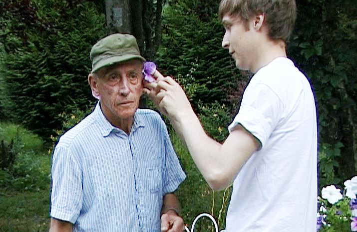 Le portrait du philosophe n’a rien d’académique. Il n’est pas isolé par le dispositif du film, mais saisi dans sa quotidienneté, loin du contexte universitaire, entouré de ses proches, dans son appartement ou à la campagne, vacant aux travaux du jardin, en promenade ou au supermarché, mais surtout, c’est la chose la plus remarquable, toujours en conversation. Le philosophe n’apparaît jamais seul, mais en dialogue constant avec divers interlocuteurs, essentiellement des jeunes gens et des enfants de son entourage. Il y a donc toujours une place pour l’autre. René Schérer est entouré d’une communauté de personnages, d’anciens soixante-huitards en vacances dans les Cévennes et leur progéniture, qui donnent au film des allures de film de famille, famille dont Franssou Prenant fait partie. René Schérer n’est donc pas un simple sujet de film. La réalisatrice fait le portrait de quelqu’un dont elle est proche et pour qui elle a une affection manifeste, ce qui donne toute sa chair au personnage. Cette proximité autorise en effet tous les jeux. Un dialogue platonicien entre le philosophe et un jeune homme au cours d’une promenade laisse apparaître sa mise en scène : d’un plan à l’autre, les protagonistes, comédiens de circonstance, reprennent leurs tirades. Sans souci du vraisemblable, Franssou Prenant n’hésite pas à jouer du doublage, à désynchroniser le son et l’image, pour privilégier la teneur de l’instant. René Schérer s’y prête volontiers, lui qui le premier s’est inventé un personnage, un double, le Professeur Poilibus, dont il dessine les aventures sur des carnets, commentaires ironiques sur les situations de tous les jours ou transcription imaginaire de son parcours de philosophe. Avec humour, et peut-être un brin de coquetterie, il n’hésite pas non plus à se mettre une fleur sur l’oreille ou à incarner, en passant dans l’épaisse fumée d’un tas de feuilles, “Empédocle se jetant dans l’Etna”.