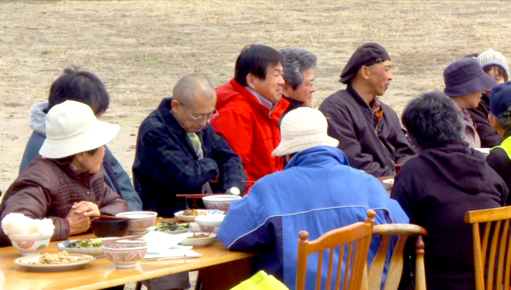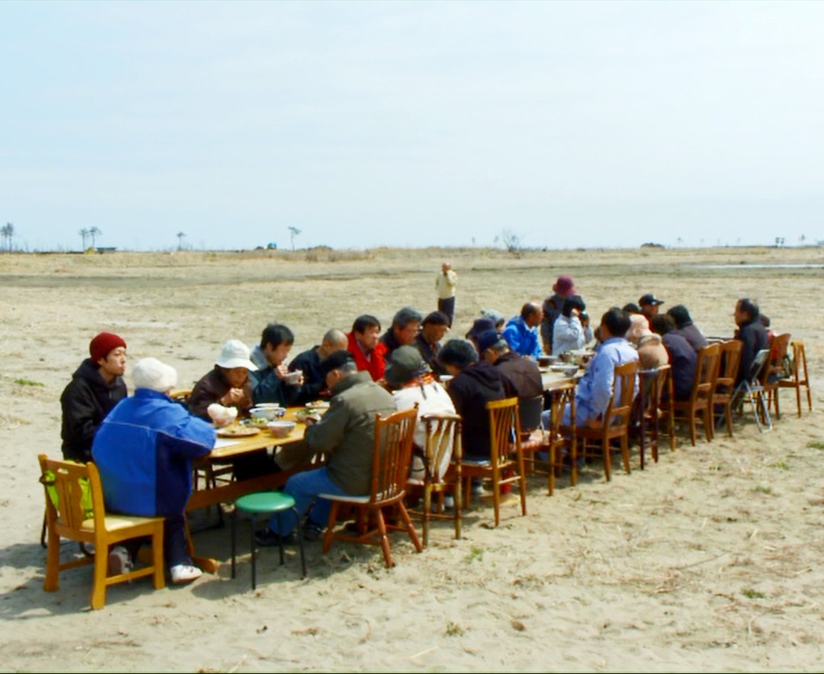 Un an après la catastrophe de Fukushima, le plasticien Jean-Luc Vilmouth (1952-2015) monte un projet avec les habitants de Yamamoto Cho et des étudiants de la Tohoku University (en lien avec l’Ecole nationale supérieure des Beaux-Arts à Paris, où il enseigne) : un banquet, dans ce paysage nu et jaune, brûlé par la mer et la radioactivité, et un film, Lunch Time. Travail sur la mémoire et le lien social dans un espace totalement dévasté, cet acte artistique fort transcende la triste réalité et questionne le futur.