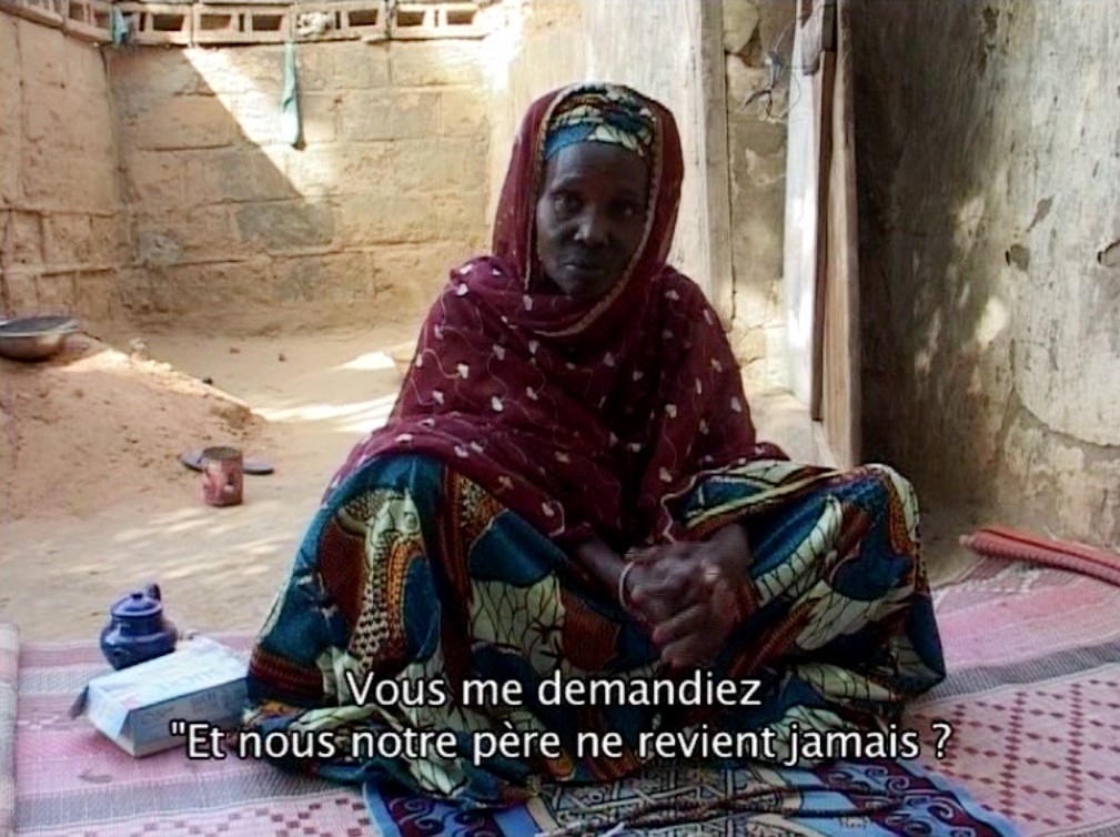 Il y a donc quelque chose de la honte au cœur de cette affaire. Les dix premières minutes des Larmes de l’émigration sont sans dialogue – comme s’il fallait annoncer que déclencher la parole de cette mère, accoucher du récit qui va suivre était un enjeu à haut risque. Omniprésents au son en revanche, les appels à la prière du muezzin et les bruits de la basse-cour. Diago filme sa mère chez elle, occupée à ses ablutions, faisant la lessive, la cuisine, ou sa prière. Les plans-séquences font ressentir jusqu’à l’engourdissement un environnement borné par la tradition et la religion. Dans la première séquence où elle est interviewée, Fatimata Ba dit à son fils : “La patience de la femme n’a pas de limites.” Loin d’accréditer la thèse d’une disposition féminine à l’attente, la démarche documentaire s’attache à souligner à quel point celle-ci est le fruit d’un construit social. En poussant sa mère dans ses retranchements, notamment quand il essaie d’introduire dans son schéma de pensée la notion de libre arbitre et de responsabilité individuelle, Diago constitue une archive sur un fait social. Mais au-delà, et sur un plan plus intime, il documente cette forme d’attente particulière, devenue un rapport au monde, une posture qui met toute la dynamique du sujet entre parenthèses 4.